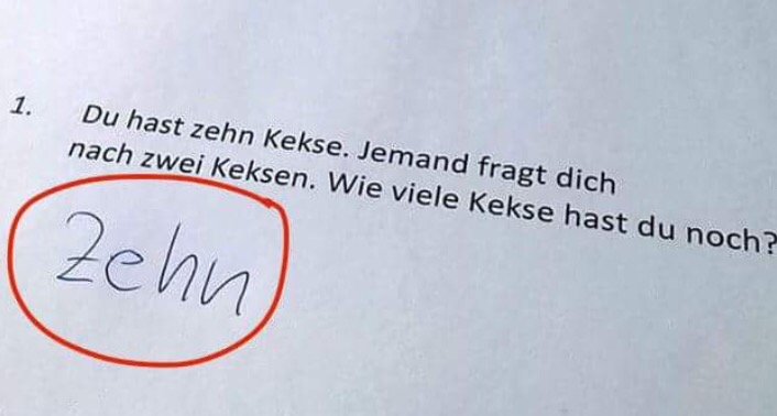 1. Ich finde Frage, als auch Antwort sehr interessant. Einmal, weil ich mich gleich an Textaufgaben aus dem Matheunterricht erinnert habe. Jedes mal die Frage: Was ist wichtig hier in der Frage, was ist was (im Dreisatz). So auch hier. Zehn Kekse habe ich also. Jemand fragt mich nach zweien. Wie viele habe ich noch? Immer noch zehn, denn fragen verringert nicht die Anzahl der Kekse. Korrekte Antwort! Wenn es sich aber gar nicht um eine Matheaufgabe, sondern um eine moralische Frage handelt, bezieht bzw.. impliziert diese Frage: Gibst du etwas ab oder nicht? In diesem Fall ist es: Zehn hast du, zwei fragt einer – Pause – Pause – Pause, was geschieht in der Pause? Jemand putzt sich die Zähne. Jemand gießt die Blumen. Haha. Und jetzt? Wie viele Kekse sind noch da (für den Befragten Keksbesitzer?). Die Antwort suggeriert, es gäbe Auskunft darüber, ob jemand teilen möchte oder großzügig ist, ob jemand hier eine moralische oder Matheaufgabe gelesen hat. Jedenfalls – vielen Dank für die Inspiration. Wie lautet denn die Antwort auf die Frage? 🙂